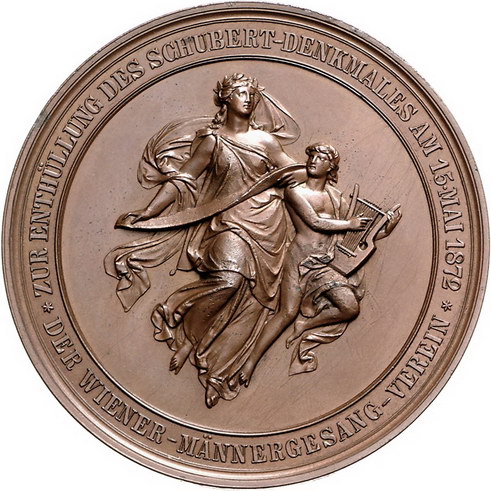 Los-Nummer: Auktion 51 - 2417 Medaillen Musiker Schubert, Franz Peter *1797 Lichtenthal bei Wien, +1828 Wien, Bronzemedaille 1872, von Tautenhayn. Auf die Enthüllung seines Denkmals in Wien. Kopf nach rechts / Schwebender weiblicher Genius mit Jüngling, der Leier spielt. Niggl 1837. 63,5 mm. Winz. Randfehler, vorzüglich + Schätzpreis: 125,- Zuschlag: unverkauft |
