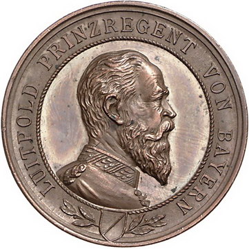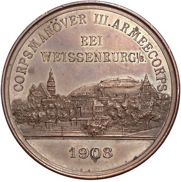 Los-Nummer: Auktion 51 - 2405 Medaillen Münchner Medailleure Goetz, Karl Bronzemedaille 1908. Auf das Corps-Manöver des III. Armeecorps bei Weissenburg i/B. Brustbild Prinzregent Luitpolds von Bayern in Uniform nach rechts / Stadtansicht in hügeliger Landschaft. Kienast 686 (Rückseite). 36,5 mm. Winz. Kratzer, vorzüglich + Schätzpreis: 300,- Zuschlag: unverkauft |