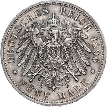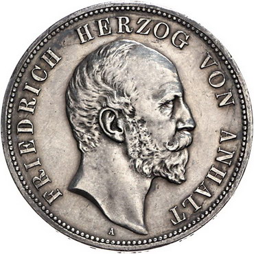 Los-Nummer: Auktion 51 - 2561 Münzen des Deutschen Kaiserreichs Anhalt Friedrich I. 1871-1904, 5 Mark 1896 A. Jaeger 21. Geputzt, fast vorzüglich Schätzpreis: 750,- Zuschlag: unverkauft |