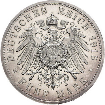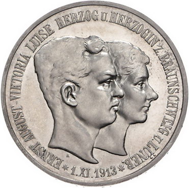 Los-Nummer: Auktion 51 - 2600 Münzen des Deutschen Kaiserreichs Braunschweig Ernst August 1913-1916, 5 Mark 1915 A. Regierungsantritt. Jaeger 58. Polierte Platte. Leicht berieben, vorzüglich - Stempelglanz Schätzpreis: 500,- Zuschlag: unverkauft |