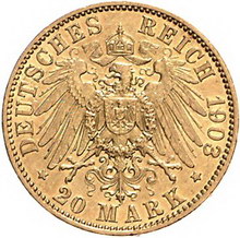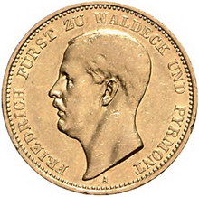 Los-Nummer: Auktion 51 - 2724 Münzen des Deutschen Kaiserreichs Waldeck-Pyrmont Friedrich Adolf 1893-1918, 20 Mark 1903 A. Jaeger 288. GOLD. Sehr schön - vorzüglich Schätzpreis: 6000,- Zuschlag: unverkauft |