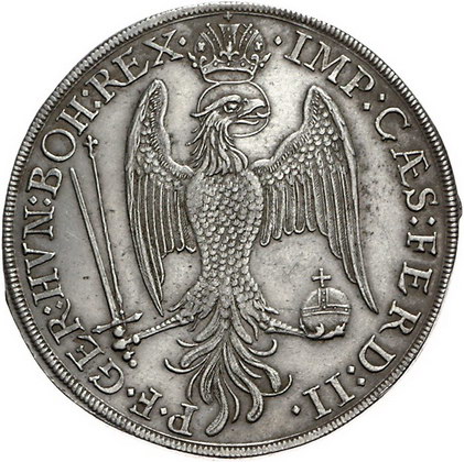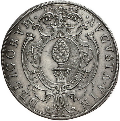 Los-Nummer: Auktion 51 - 51 Altdeutsche Münzen und Medaillen Augsburg, Stadt Taler 1626. Pyr in ovaler, reich verzierter Einfassung, darüber Engelsköpfchen / Gekrönter nach rechts blickender Adler mit Zepter, Schwert und Reichsapfel. Forster 184, Davenport 5021. Fast vorzüglich Schätzpreis: 300,- Zuschlag: 360,- |