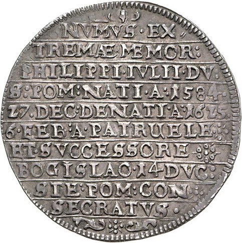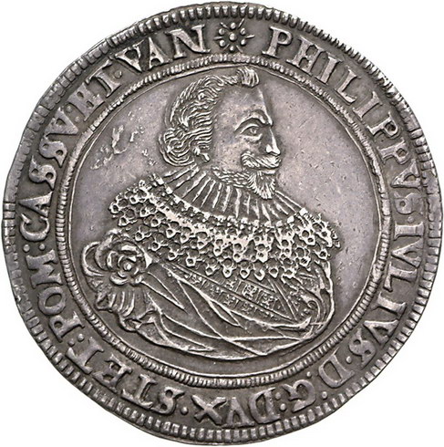 Los-Nummer: Auktion 51 - 1380 Altdeutsche Münzen und Medaillen Pommern-Wolgast Philipp Julius 1592-1625, Taler 1625. Auf seinen Tod. Drapiertes Brustbild mit großem besticktem Kragen nach rechts / Zehn Zeilen Schrift. Hildisch 231, Slg. Pogge 917. Schöne Patina. Fast vorzüglich Schätzpreis: 4000,- Zuschlag: 5400,- |