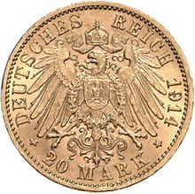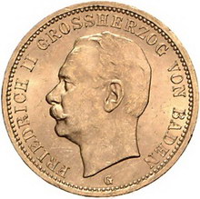 Los-Nummer: Auktion 51 - 2581 Münzen des Deutschen Kaiserreichs Baden Friedrich II. 1907-1918, 20 Mark 1914 G. Jaeger 192. GOLD. Vorzüglich - Stempelglanz Schätzpreis: 200,- Zuschlag: unverkauft |