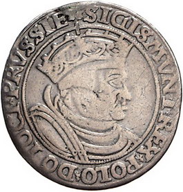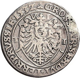 Los-Nummer: Auktion 51 - 1432 Altdeutsche Münzen und Medaillen Preußen (Westpreußen) Sigismund I. 1506-1548, 6 Gröscher 1532. Gekröntes geharnischtes Brustbild nach rechts / Adlerschild zwischen Münzmeisterinitialen T-I, darüber römische Wertzahl. Neumann 72, Schulten 2800, Gumowski 538. Henkelspur, schön - sehr schön Schätzpreis: 1000,- Zuschlag: 3850,- |