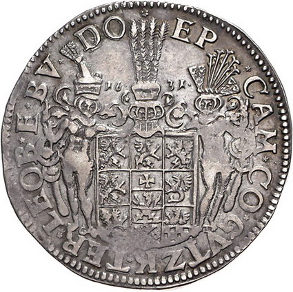 Los-Nummer: Auktion 51 - 1381 Altdeutsche Münzen und Medaillen Pommern-nach der Vereinigung Bogislaw XIV. 1620-1637, Taler 1631. Die Umschrift durchbrechendes, leicht nach rechts gerücktes Brustbild nach rechts / Zwei Wilde Männer halten behelmtes, zehnfeldiges Wappen, neben dem Helmschmuck geteilt die Jahreszahl. Hildisch 319, Davenport 7276. Schöne Patina. Winz. Randfehler, sehr schön + Schätzpreis: 3000,- Zuschlag: 2400,- |