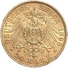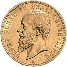 Los-Nummer: Auktion 51 - 2720 Münzen des Deutschen Kaiserreichs Schaumburg-Lippe Georg 1893-1911, 20 Mark 1898 A. Jaeger 285. GOLD. Kl. Randfehler, fast vorzüglich Schätzpreis: 2000,- Zuschlag: unverkauft |