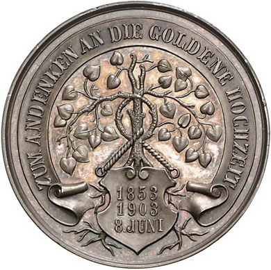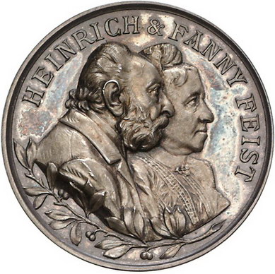 Los-Nummer: Auktion 51 - 2287 Medaillen Gelegenheitsmedaillen Hochzeitsjubiläen Medaille 1903. Auf die Goldene Hochzeit von Heinrich und Fanny Feist. Die Brustbilder des Paares über Lorbeerzweig nebeneinander nach rechts / Bäumchen mit Wappen, darüber Spruchband. 39,5 mm, 37,62 g. Etui. Fast Stempelglanz Schätzpreis: 125,- Zuschlag: 100,- |