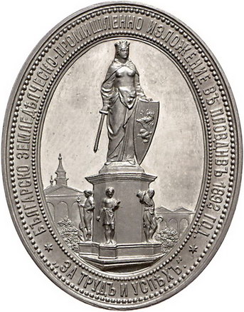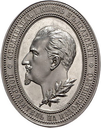Los-Nummer: Auktion 51 - 2922 Ausländische Münzen und Medaillen Bulgarien Ferdinand I. 1887-1918, Ovale versilberte Verdienstmedaille 1892 der landwirtschaftlichen Ausstellung. Büste über Zweig nach links / Ansicht eines Denkmals. 44,5 x 35,5 mm, 29,94 g. Polierte Platte Schätzpreis: 250,- Zuschlag: 230,- |