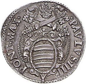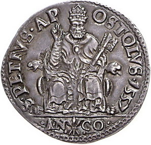 Los-Nummer: Auktion 51 - 3187 Ausländische Münzen und Medaillen Italien-Kirchenstaat Paolo IV. 1555-1559, Testone 1557, Ancona. Muntoni 29. Prachtexemplar. Herrliche Patina. Vorzüglich - Stempelglanz Schätzpreis: 750,- Zuschlag: 850,- |