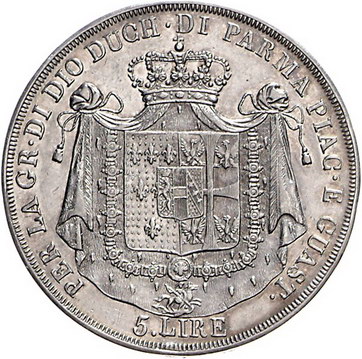 Los-Nummer: Auktion 51 - 3224 Ausländische Münzen und Medaillen Italien-Parma Maria Luigia 1815-1847, 5 Lire 1815. Pagani 5, Davenport 204. Fast vorzüglich Schätzpreis: 175,- Zuschlag: unverkauft |
