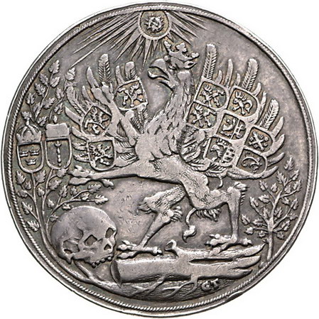 Los-Nummer: Auktion 51 - 1385 Altdeutsche Münzen und Medaillen Pommern-nach der Vereinigung Bogislaw XIV. 1620-1637, Taler 1654. Auf seine Beisetzung. Unter strahlender Sonne gekrönter Greif mit neun Wappen und der Blutfahne zwischen Bäumchen mit den Wappen von Schweden und Brandenburg, unten Baum und Schädel und die Signatur von Gottfried Tappert / Elf Zeilen Schrift in dreifachem Schriftkreis. Hildisch 380, Slg. Pogge 1111 , Slg. Bratring 402, Slg. von Wasserschleben 68. Sehr selten. Sehr schön Schätzpreis: 5000,- Zuschlag: 9250,- |