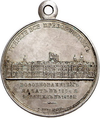 Los-Nummer: Auktion 51 - 3810 Ausländische Münzen und Medaillen Russland Nikolaus I. 1825-1855, Medaille 1839, von Gube. Auf die Wiederherstellung des Winterpalastes. Gebäudeansicht / Monogramm. Diakov 551.1 (R3) , Smirnov 498, Slg. Reichel 3679. 33 mm, 20,41 g. Originalöse. Mattiert. Vorzüglich Schätzpreis: 3000,- Zuschlag: 3300,- |
