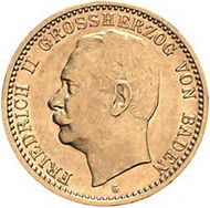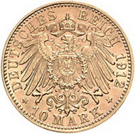 Los-Nummer: Auktion 51 - 2579 Münzen des Deutschen Kaiserreichs Baden Friedrich II. 1907-1918, 10 Mark 1912 G. Jaeger 191. GOLD. Fast vorzüglich / vorzüglich Schätzpreis: 750,- Zuschlag: unverkauft |