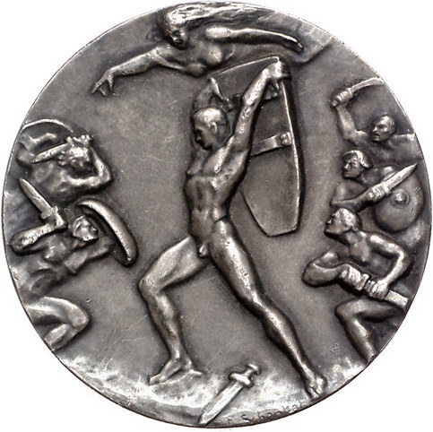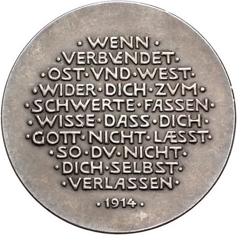 Los-Nummer: Auktion 51 - 2509 Medaillen Erster Weltkrieg Medaille 1914. Auf den Ausbruch des Weltkrieges. Unbekleideter mit erhobenem Schild wehrt sich gegen Angreifer / Schrift. Zetzmann -. 49,5 mm, 50,12 g. Mattiert. Vorzüglich Schätzpreis: 200,- Zuschlag: unverkauft |