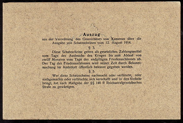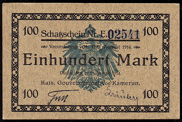 Los-Nummer: Auktion 51 - 2770 Kolonien und Nebengebiete Kamerun 100 Mark vom 12.08.1914. Rosenberg 964 b. Fast kassenfrisch Schätzpreis: 600,- Zuschlag: unverkauft |