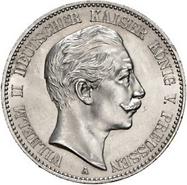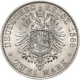 Los-Nummer: Auktion 51 - 2651 Münzen des Deutschen Kaiserreichs Preußen Wilhelm II. 1888-1918, 2 Mark 1888 A. Jaeger 100. Prachtexemplar. Fast Stempelglanz Schätzpreis: 500,- Zuschlag: 400,- |