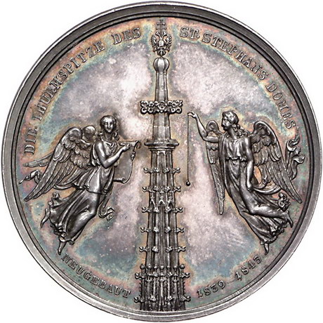 Los-Nummer: Auktion 51 - 2211 Haus Habsburg Haus Habsburg Ferdinand I. 1835-1848, Medaille 1843, von Roth. Auf den Ausbau des Stephansdoms in Wien. Belorbeerte Büste nach rechts / Die Turmspitze, an den Seiten schwebende Engel. Slg. Montenuovo 2605. 46,5 mm, 52,63 g. Schöne Patina. Vorzüglich - Stempelglanz Schätzpreis: 150,- Zuschlag: 165,- |