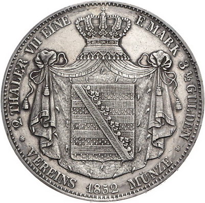 Los-Nummer: Auktion 51 - 1718 Altdeutsche Münzen und Medaillen Sachsen-Altenburg Georg 1848-1853, Doppeltaler 1852 F. Jaeger 112, Thun 355, AKS 58, Kahnt 482. Henkelspur, Rand und Felder minimal bearbeitet, sehr schön + Schätzpreis: 300,- Zuschlag: 330,- |