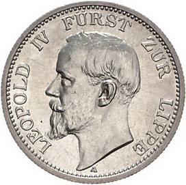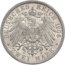 Los-Nummer: Auktion 51 - 2621 Münzen des Deutschen Kaiserreichs Lippe Leopold IV. 1904-1918, 2 Mark 1906 A. Jaeger 78. Vorzüglich - Stempelglanz Schätzpreis: 300,- Zuschlag: unverkauft |