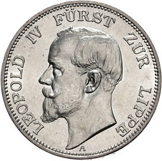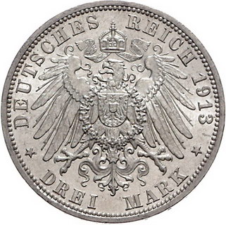 Los-Nummer: Auktion 51 - 2622 Münzen des Deutschen Kaiserreichs Lippe Leopold IV. 1904-1918, 3 Mark 1913 A. Jaeger 79. Vorzüglich - Stempelglanz Schätzpreis: 300,- Zuschlag: unverkauft |