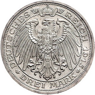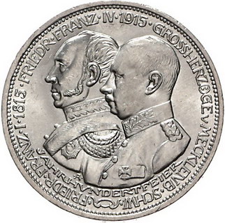 Los-Nummer: Auktion 51 - 2629 Münzen des Deutschen Kaiserreichs Mecklenburg-Schwerin Friedrich Franz IV. 1897-1918, 3 Mark 1915 A. Auf die Jahrhundertfeier. Jaeger 88. Fast Stempelglanz Schätzpreis: 125,- Zuschlag: 165,- |