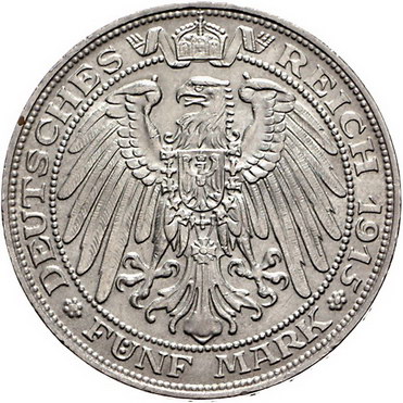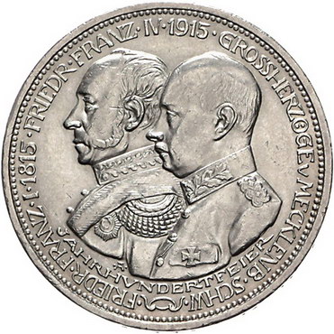 Los-Nummer: Auktion 51 - 2632 Münzen des Deutschen Kaiserreichs Mecklenburg-Schwerin Friedrich Franz IV. 1897-1918, 5 Mark 1915 A. Jahrhundertfeier. Jaeger 89. Winz. Randfehler, vorzüglich Schätzpreis: 400,- Zuschlag: unverkauft |