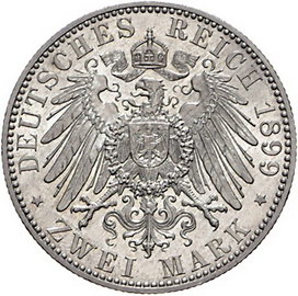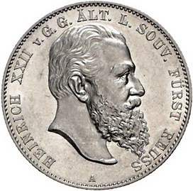 Los-Nummer: Auktion 51 - 2663 Münzen des Deutschen Kaiserreichs Reuss, ältere Linie Heinrich XXII. 1859-1902, 2 Mark 1899 A. Jaeger 118. Winz. Kratzer, vorzüglich Schätzpreis: 300,- Zuschlag: unverkauft |
