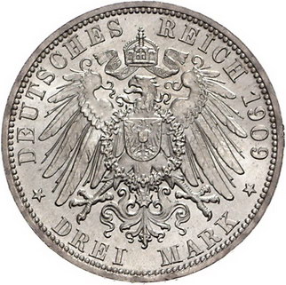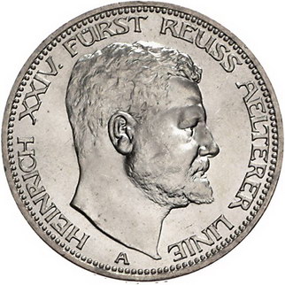 Los-Nummer: Auktion 51 - 2666 Münzen des Deutschen Kaiserreichs Reuss, ältere Linie Heinrich XXIV. 1902-1918, 3 Mark 1909 A. Jaeger 119. Fast Stempelglanz Schätzpreis: 400,- Zuschlag: unverkauft |