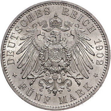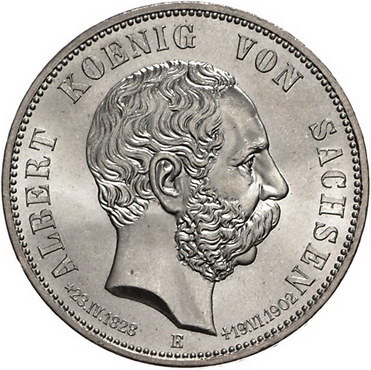 Los-Nummer: Auktion 51 - 2678 Münzen des Deutschen Kaiserreichs Sachsen Albert 1873-1902, 5 Mark 1902 E. Auf seinen Tod. Jaeger 128. Vorzüglich - Stempelglanz Schätzpreis: 125,- Zuschlag: unverkauft |