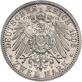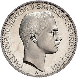 Los-Nummer: Auktion 51 - 2700 Münzen des Deutschen Kaiserreichs Sachsen-Coburg-Gotha Carl Eduard 1900-1918, 2 Mark 1905 A. Jaeger 147. Polierte Platte. Vorzüglich - Stempelglanz Schätzpreis: 600,- Zuschlag: unverkauft |