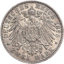 Los-Nummer: Auktion 51 - 2721 Münzen des Deutschen Kaiserreichs Schwarzburg-Rudolstadt Günther Victor 1890-1918, 2 Mark 1898 A. Jaeger 167. Sehr schön Schätzpreis: 175,- Zuschlag: unverkauft |