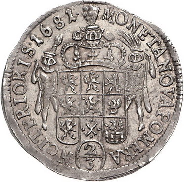 Los-Nummer: Auktion 51 - 1395 Altdeutsche Münzen und Medaillen Pommern-unter schwedischer Besetzung Karl XI. 1660-1697, 2/3 Taler 1681 CS. S.B. 91, Davenport 763. #0764} Schöne Patina. Zainende, fast vorzüglich Schätzpreis: 250,- Zuschlag: 420,- |