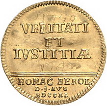 Los-Nummer: Auktion 51 - 447 Altdeutsche Münzen und Medaillen Brandenburg-Preußen Friedrich II. 1740-1786, Dukat 1740, Berlin. Huldigung zu Berlin. Olding 374, v. Schrötter 1, Friedberg 2366. GOLD. Graffiti, leicht gewellt, fast vorzüglich Schätzpreis: 600,- Zuschlag: 660,- |