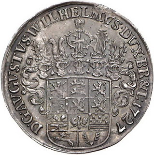 Los-Nummer: Auktion 51 - 641 Altdeutsche Münzen und Medaillen Braunschweig-Wolfenbüttel August Wilhelm 1714-1731, 1/4 Taler 1727 EPH, Zellerfeld. Wilder Mann. Welter 2392 Nachtrag. Henkelspur, sehr schön + Schätzpreis: 200,- Zuschlag: 200,- |