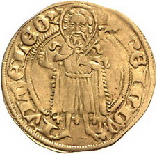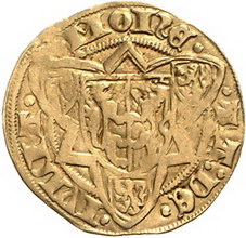 Los-Nummer: Auktion 51 - 953 Altdeutsche Münzen und Medaillen Jülich Reinald 1402-1423, Goldgulden o.J. (1410), Jülich. St. Johannes / Wappen in Dreipass, in den Winkeln drei Wappen. Noss 153 ff, Friedberg 1364. GOLD. Fast sehr schön Schätzpreis: 300,- Zuschlag: 260,- |