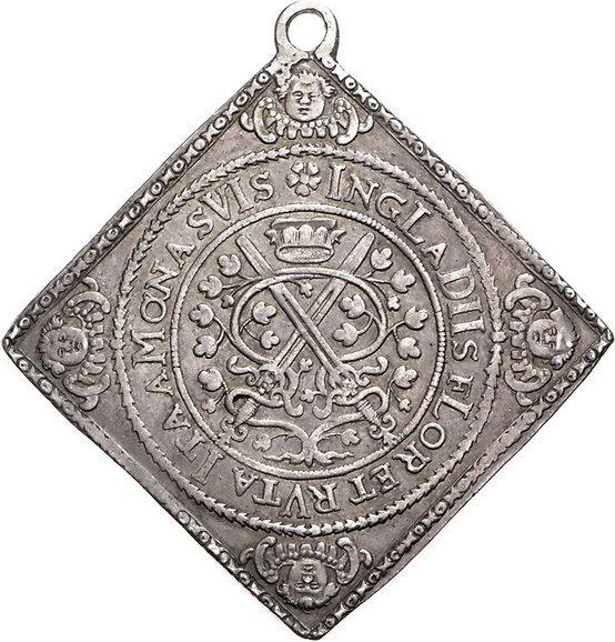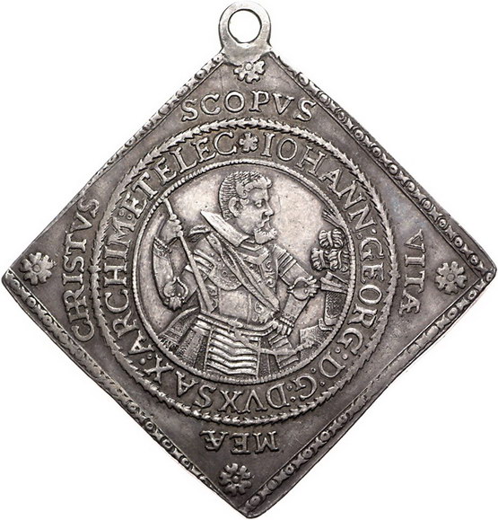 Los-Nummer: Auktion 51 - 1550 Altdeutsche Münzen und Medaillen Sachsen-Albertinische Linie Johann Georg I. 1615-1656, Talerklippe 1615. Zur Taufe des Prinzen Christian. Clauss/Kahnt 83, Slg. Merseburger 2295 (ungenau), Schnee 805, Davenport 7587. #083,84} Alter Henkel. Schöne Patina. Sehr schön + Schätzpreis: 400,- Zuschlag: 370,- |
