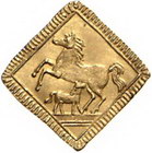 Los-Nummer: Auktion 51 - 1898 Altdeutsche Münzen und Medaillen Württemberg-Stuttgart, Stadt 1/4 Dukatenklippe o.J. (1740-1770), von Daniel. Pferd mit Fohlen / Wappen. Binder 31, Slg. Wurster 1872. 0,86 g. GOLD. Vorzüglich Schätzpreis: 500,- Zuschlag: 450,- |