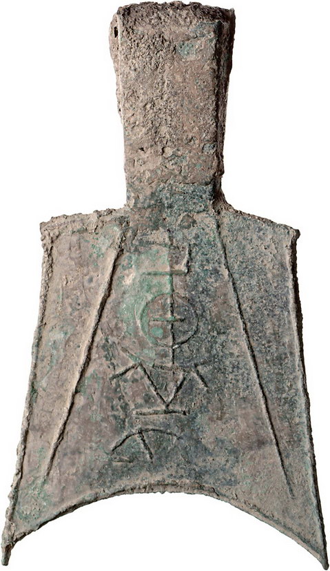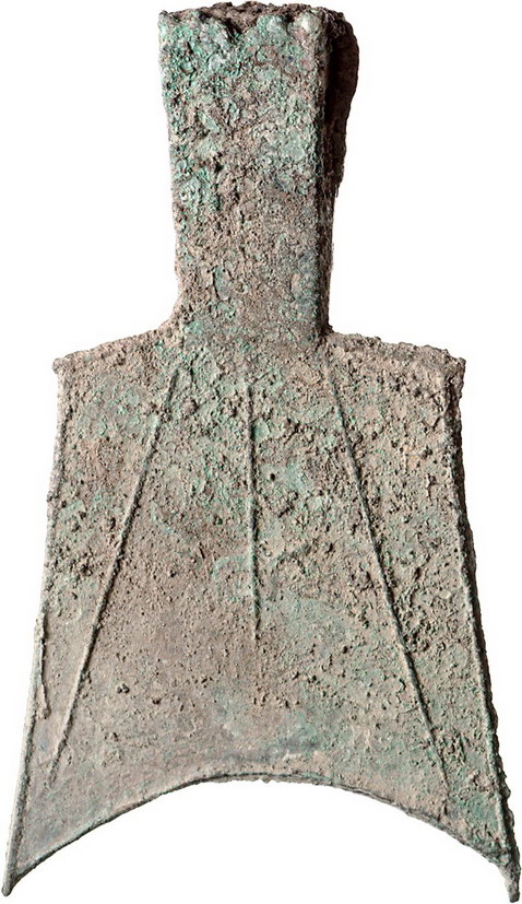 Los-Nummer: Auktion 51 - 2931 Ausländische Münzen und Medaillen China Chou Dynastie 1122-255 v. Chr. #3Staat Jin in Westhenan#. Könige von Zhou 524 - ca. 400 v. Chr. Hohlkopf-Spatengeld mit fallenden Schultern, Bronze. Münzstätte Shan Xian. Inschrift: 'Lu shi' (Lu Klan). Schjöth 41. 85 x 50 mm, 23,42 g. Leichte Fundauflagen, leicht grünliche Patina. Sehr schön - vorzüglich Schätzpreis: 500,- Zuschlag: 475,- |