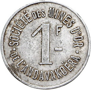 Los-Nummer: Auktion 51 - 3399 Ausländische Münzen und Medaillen Madagaskar Französische Kolonie 1896-1958-1960, Société des Mines d'or de l'Andavakoera (1911-1921). Aluminium Token zu 50 Centimes und 1 Franc o.J. (1920). Lecompte 84, 85, K.M. Tn 2, 3. 2 Stück. Sehr schön Schätzpreis: 100,- Zuschlag: unverkauft |