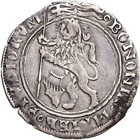 Los-Nummer: Auktion 51 - 3172 Ausländische Münzen und Medaillen Italien-Bologna Anonyme päpstliche Prägung 1360 bis Mitte des 15. Jahrhunderts, Grosso o.J. Sitzender Heiliger mit Kirchenmodell und Krummstab / Löwe mit Fahne. Biaggi 395/400. Sehr schön Schätzpreis: 125,- Zuschlag: 190,- |