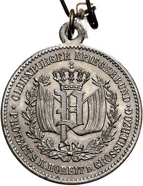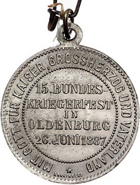 Los-Nummer: Auktion 51 - 1321 Altdeutsche Münzen und Medaillen Oldenburg Nicolaus Friedrich Peter 1853-1900, Tragbare versilberte Zinnmedaille 1887, von Rannenberg. Auf das 15. Bundeskriegerfest in Oldenburg. Gekröntes P auf gekreuzten Standarten zwischen Eichen- und Lorbeerzweig / Schrift. 29,5 mm. Fast vorzüglich Schätzpreis: 60,- Zuschlag: 90,- |