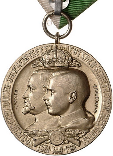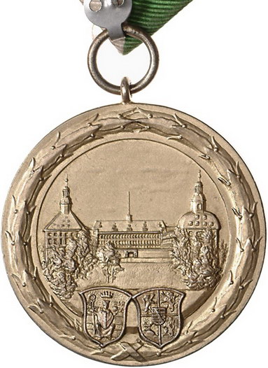 Los-Nummer: Auktion 51 - 1658 Altdeutsche Münzen und Medaillen Sachsen-Gotha, Stadt Vergoldete Medaille 1911. Auf das 50jährige Bestehen des deutschen Schützenbundes. Die Brustbilder Ernsts II. und Carl Eduards unter Krone nach links / Ansicht des Schlosses in Lorbeerkranz, unten zwei Wappen. Slg. Peltzer 1213. 38,5 mm, 32,64 g. Mit grün-weißem Band. Mattiert. Vorzüglich Schätzpreis: 150,- Zuschlag: 320,- |