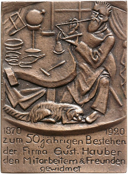 Los-Nummer: Auktion 51 - 1772 Altdeutsche Münzen und Medaillen Schwäbisch Gmünd, Stadt Bronzegussplakette#0Medaille# 1920. Auf das 50jährige Bestehen der Schmuckfabrik Gustav Hauber, Widmung der Mitarbeiter und Freunde. Bärtiger Kopf mit Brille fast von vorn / Gustav Hauber in seinem Atelier bei der Arbeit, zu seinen Füßen liegender Hund, darunter fünf Zeilen Schrift. 66 x 49,5 mm. Gussfrisch Schätzpreis: 90,- Zuschlag: unverkauft |