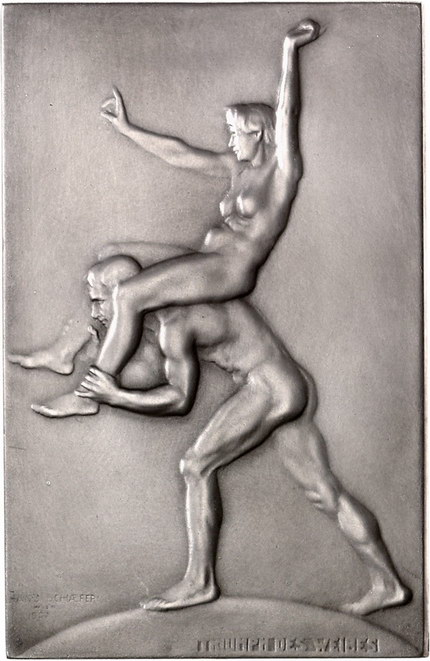 Los-Nummer: Auktion 51 - 2313 Medaillen Kunstmedaillen Schaefer, Hans Einseitige versilberte Bronzeplakette#0Medaille# o.J. 'Triumph des Weibes'. Unbekleideter Mann trägt unbekleidete Frau auf seinem Rücken. 91,5 x 59 mm, 137,88 g. Mattiert. Vorzüglich Schätzpreis: 150,- Zuschlag: 190,- |
