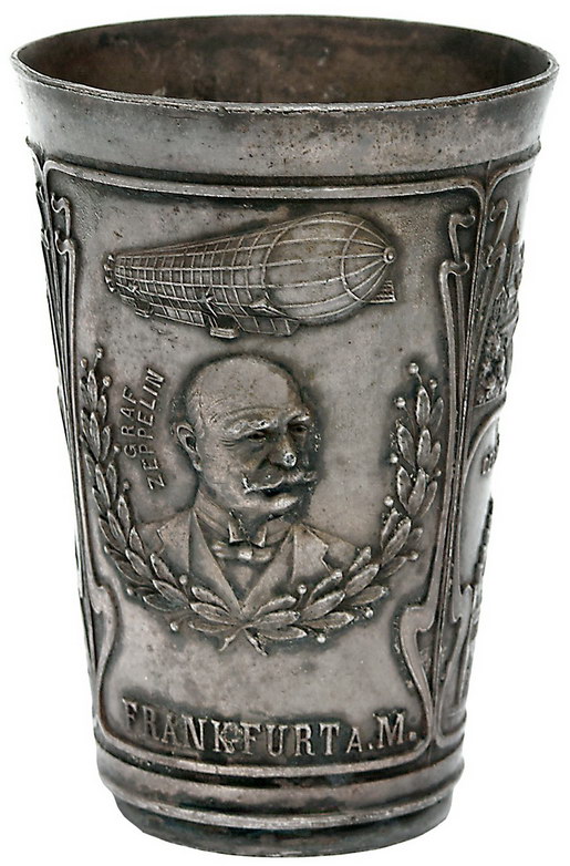 Los-Nummer: Auktion 51 - 2322 Medaillen Luftfahrt Bronzierter Zinnbecher#0Medaille# 1909. Zwischen Eichenzweigen Brustbild Graf Zeppelins fast von vorn, darüber Luftschiff, weiterhin vier Stadtmotive von Frankfurt: Stadtansicht mit Mainbrücke, Römer, Festhalle und Gesellschaftshaus im Palmengarten. Kaiser -, Button -. Höhe 85,5 mm. Winz. Kerben im Rand, sehr schön - vorzüglich Schätzpreis: 150,- Zuschlag: unverkauft |