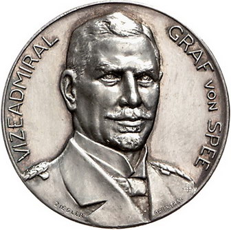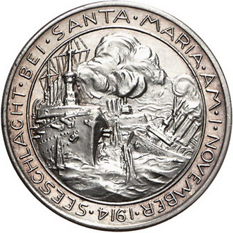 Los-Nummer: Auktion 51 - 2471 Medaillen Schiffahrt Medaille 1914, von Ziegler und Grünthal. Auf Vizeadmiral Graf von Spee und die Seeschlacht bei Santa Maria. Brustbild in Uniform halbrechts / Darstellung der Seeschlacht. Zetzmann 4047. 34 mm, 17,10 g. Winz. Kratzer, vorzüglich Schätzpreis: 150,- Zuschlag: unverkauft |