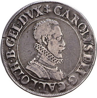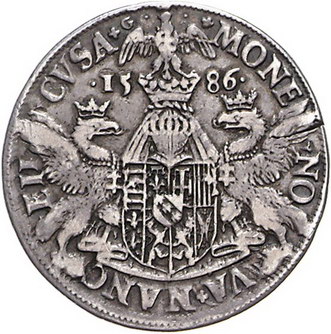 Los-Nummer: Auktion 51 - 3041 Ausländische Münzen und Medaillen Frankreich-Lothringen Karl II. (III.) 1545-1608, Halbtaler 1586, Nancy. Geharnischtes Brustbild nach rechts / Zwei gekrönte Greifen halten gekröntes Wappen, darüber Adler. De Saulcy Tf. 22/13 , Boudeau 1526. Sehr selten. Sehr schön Schätzpreis: 10000,- Zuschlag: 11500,- |