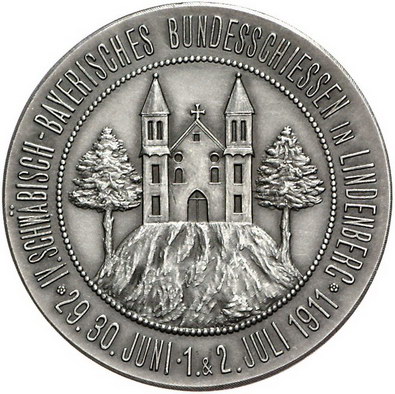 Los-Nummer: Auktion 51 - 150 Altdeutsche Münzen und Medaillen Bayern-Lindenberg, Stadt Medaille 1911. Auf das 4. schwäbisch-bayerische Bundesschiessen. Brustbild Prinzregent Luitpolds von Bayern in Uniform und umgelegtem Hermelin nach rechts / Kirche zwischen zwei Tannen auf Hügel. Slg. Peltzer -. 40 mm, 25,08 g. Mattiert. Vorzüglich Schätzpreis: 100,- Zuschlag: 80,- |
