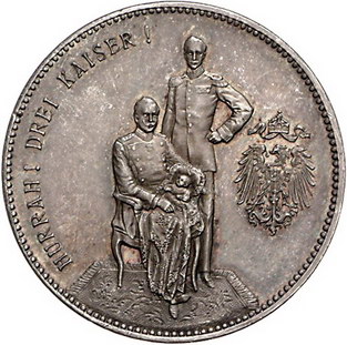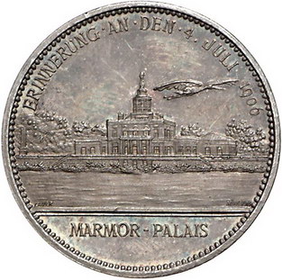 Los-Nummer: Auktion 51 - 584 Altdeutsche Münzen und Medaillen Brandenburg-Preußen Wilhelm II. 1888-1918, Medaille 1906. Auf die Geburt des Kronprinzen. Sitzender Kaiser Wilhelm II. mit Enkel Wilhelm, hinter ihm Kronprinz Friedrich Wilhelm / Ansicht des Marmorpalastes, im Vordergrund fliegt Storch über Fluss. 32 mm, 17,76 g. Schöne Patina. Fast Stempelglanz Schätzpreis: 100,- Zuschlag: 80,- |